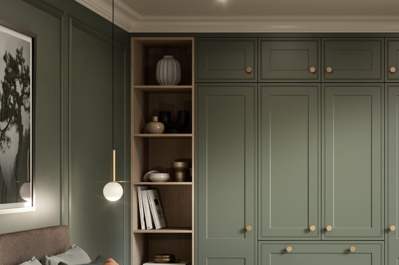Add timeless character to your home with the Bella Tullymore Supermatt Smoke Green and Urban Oak fitted bedroom. This classic shaker-style bedroom combines soft green tones with a warm oak finish for a calm, contemporary look. Fully made-to-measure and designed to maximise bedroom storage in any space. Available in over 30 fitted bedroom door styles and finishes.