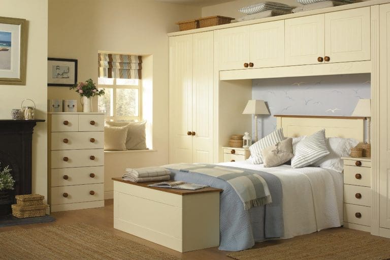 The warming effect of our Newport doors in Vanilla will brighten any bedroom but leave it cosy enough that you may never want to get out from under your duvet. This bespoke fitted furniture will also create lots of storage space to leave a clutter-free space.
