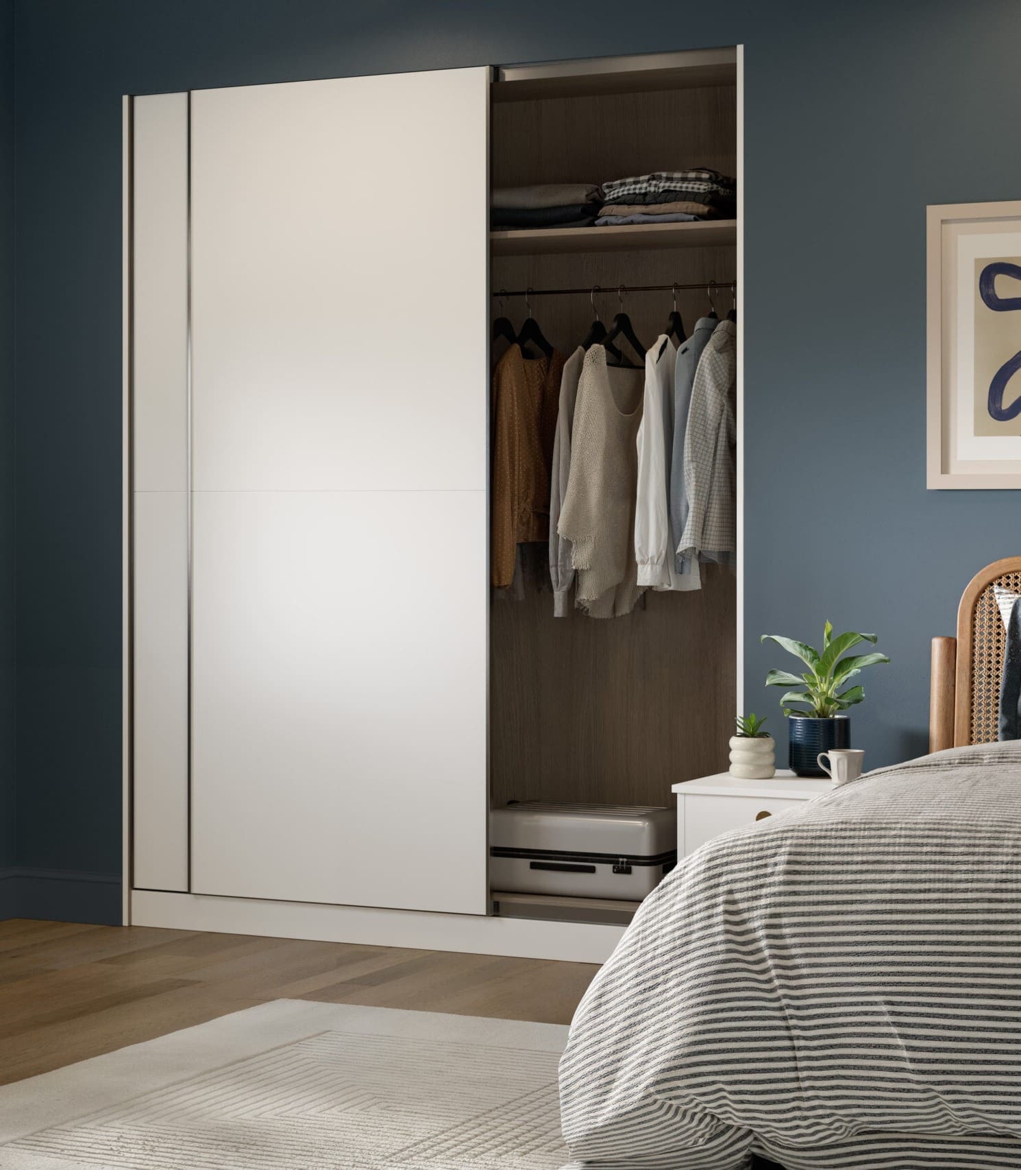 Brighten your bedroom with the Valore Matt Snow White fitted bedroom, featuring sleek sliding doors for effortless style and space-saving storage. Perfectly made to measure, this modern bedroom design suits any room layout.