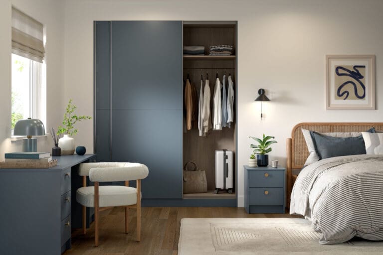 Transform your space with the Valore Matt Alby Blue fitted bedroom featuring smooth sliding doors. Perfect for modern homes, this made-to-measure bedroom offers sleek style and maximised storage, ideal for rooms where space is at a premium. Available in many other finsihes.