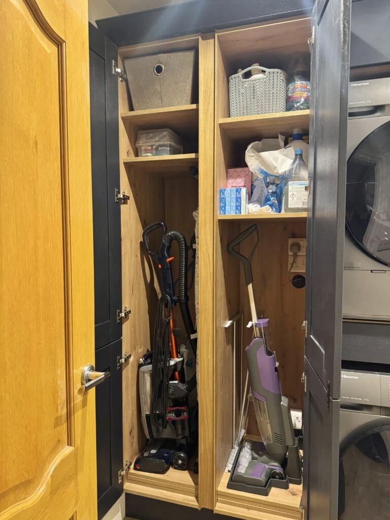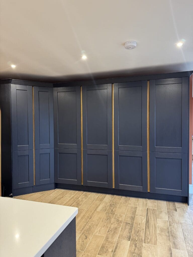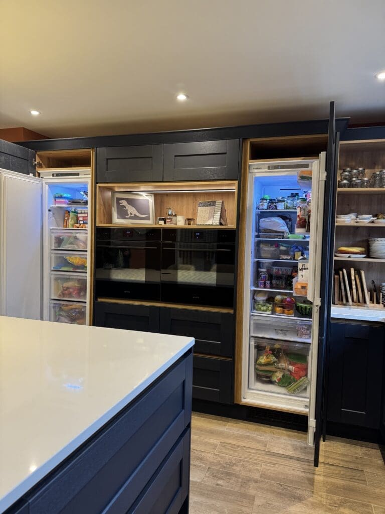 The corner walk-in larder was custom built to our clients’ exact specifications, creating a truly premium storage solution that you simply don’t get with standard kitchens.