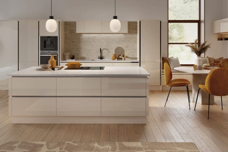 Elevate your home with the Bella InRail High Gloss Cream Kitchen, designed in the elegant Venice style. Its high-gloss cream finish reflects light beautifully, creating a bright and airy atmosphere while maintaining a sophisticated, timeless appeal.