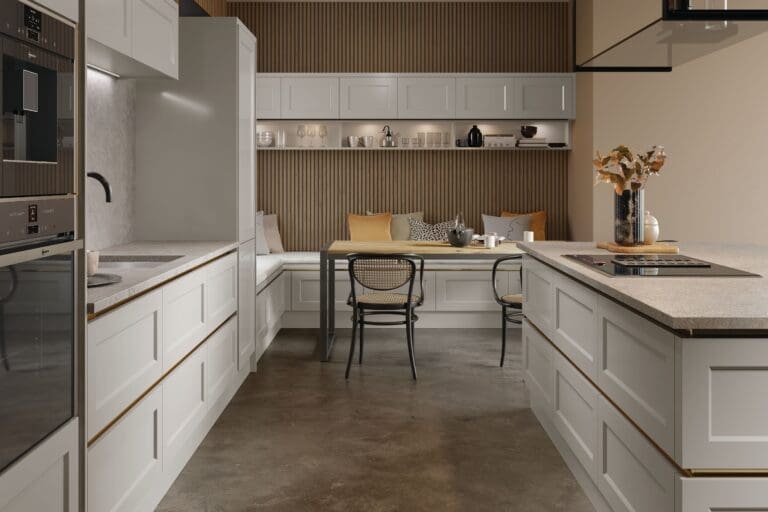 Introducing the InRail True Handleless kitchen, a sleek minimalist style designed to bring finesse and a beautiful finishing touch to your home. Shown here in the elegant Richmond door style with a soft Pebble finish, this design combines the clean lines of a true handleless kitchen with the timeless character of a shaker-inspired door.
