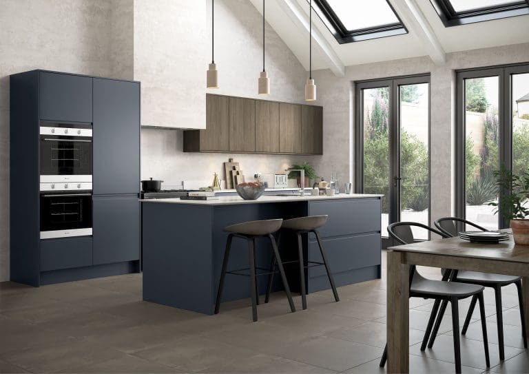 The Strada Matte Slate Blue & Rezana Espresso kitchen combines sleek design with modern functionality. Featuring a smooth matte finish, the slab door with an integrated J-handle offers a minimalist look that’s both stylish and practical. Available in over 29 paint-to-order finishes, you can customise this door to suit your exact preferences. The matte slate blue paired with the rich Rezana espresso creates a striking contrast, making it an ideal choice for a sophisticated, contemporary kitchen.