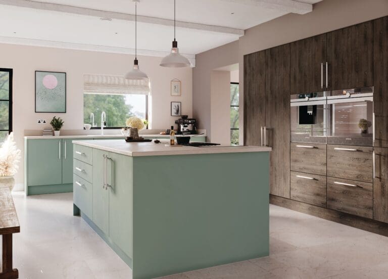 Transform your kitchen with our modern Valore woodgrain kitchen doors available in a Fjord and Graphite Denver Oak finish. The warmth of the Graphite Denver Oak paired with the colourful Fjord makes for a great kitchen design recipe.