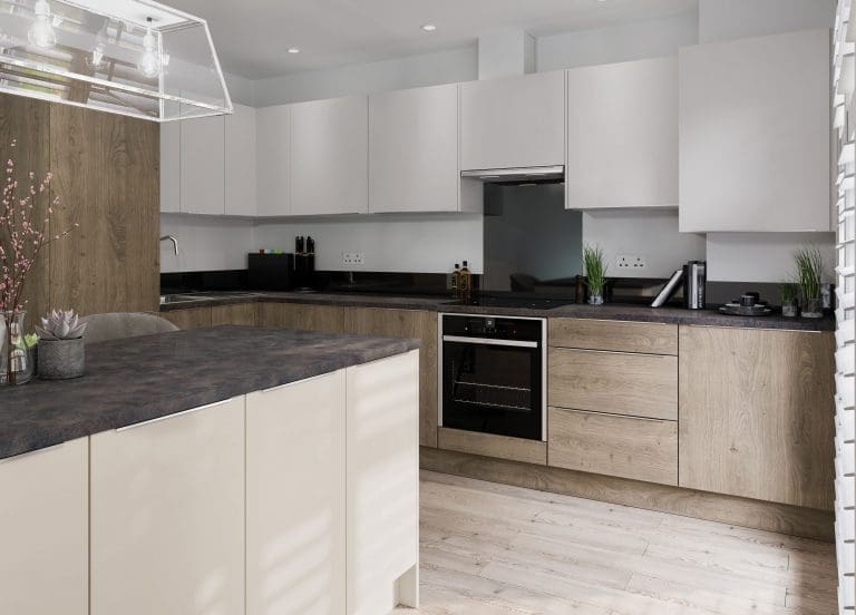 Make the kitchen the heart of your home with our Valore range, available in Light Grey, Cashmere and Truffle Brown Denver Oak. The neutral palette offers homes a warm atmosphere, whilst being durable and practical for everyday life.