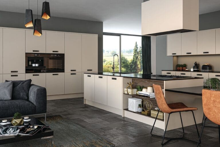 The timeless Supermatt Cashmere, this stunning finish is sure to bring light and life to any kitchen. Pair with dark tops to complete this contemporary look.