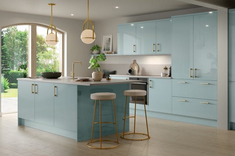 Ready to brighten up your kitchen space? This Zurfiz Ultragloss Metallic Blue handleless kitchen is a stylish, sleek look that, when paired with a white glossy worktop, really opens up the space.