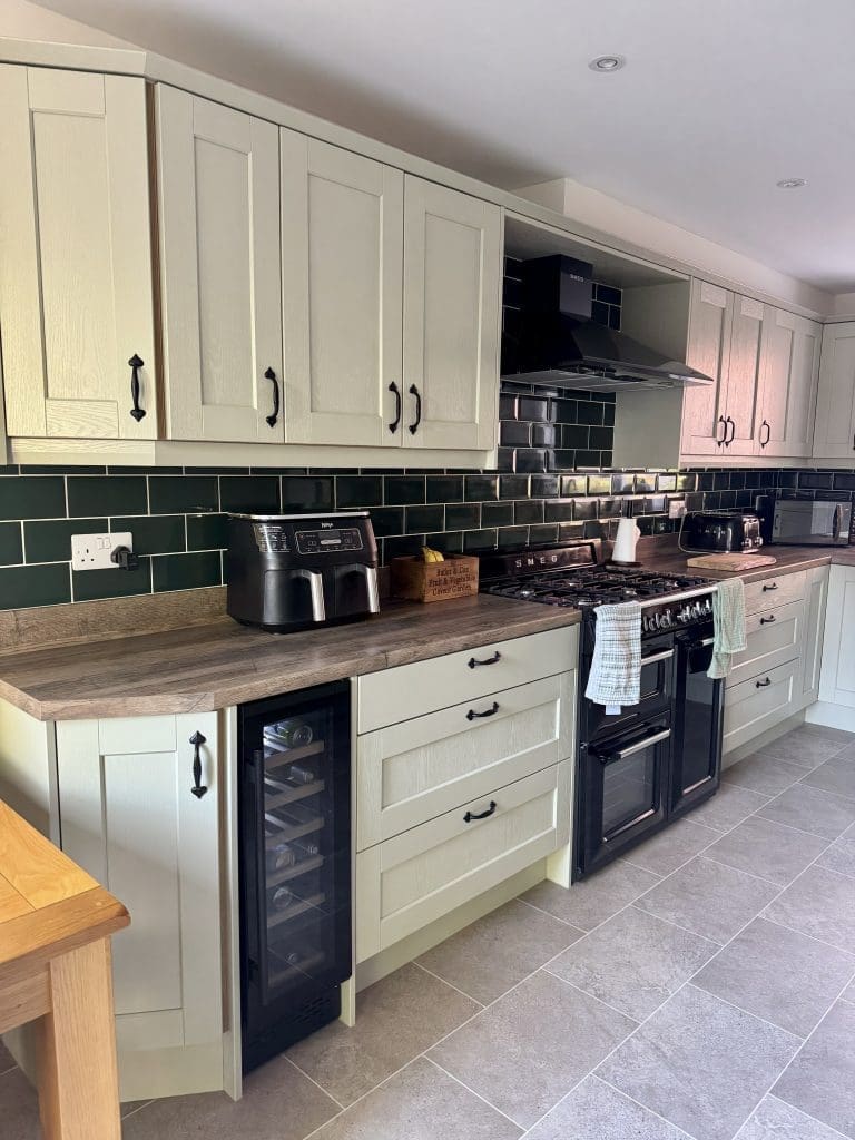 When it comes to designing a dream kitchen, a well-thought-out layout, color scheme, and work surface make all the difference. In our recent kitchen project, we transformed a closed-off space by removing a wall, creating a seamless open-concept kitchen. This stunning green shaker kitchen, complemented by butcher block laminate worktops, has brought both style and functionality to the home.